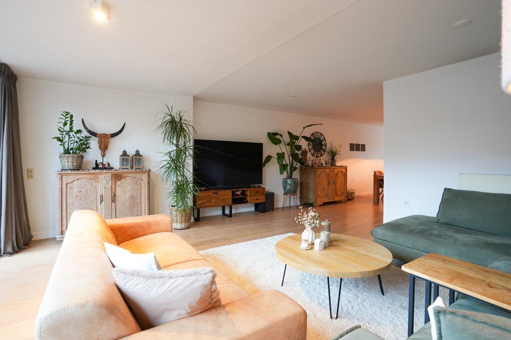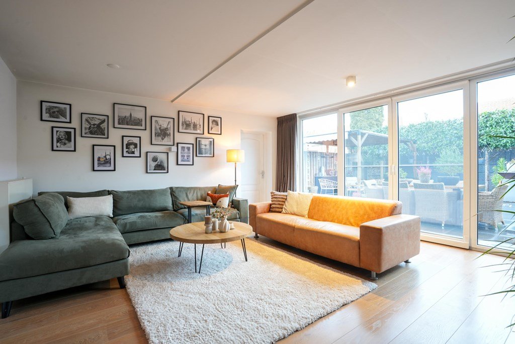 De woonkamer is ruim en licht, met schuifdeuren naar de tuin die bijna uitnodigen om ze elk seizoen open te gooien.