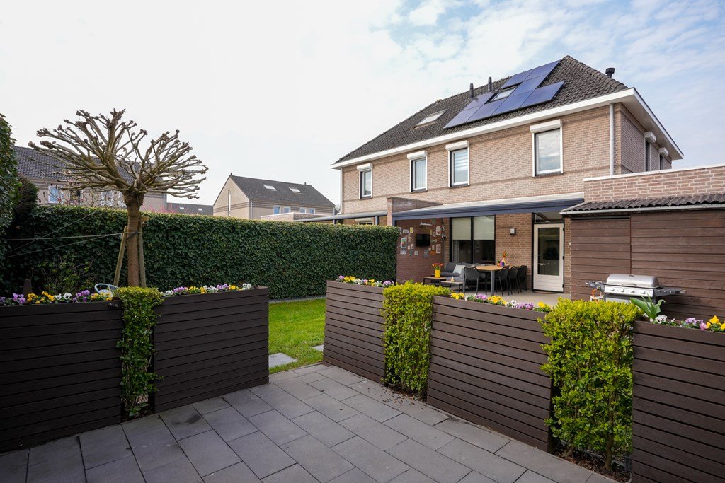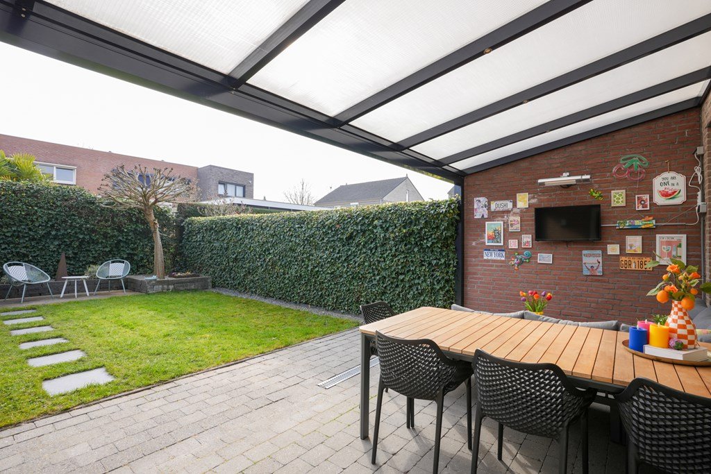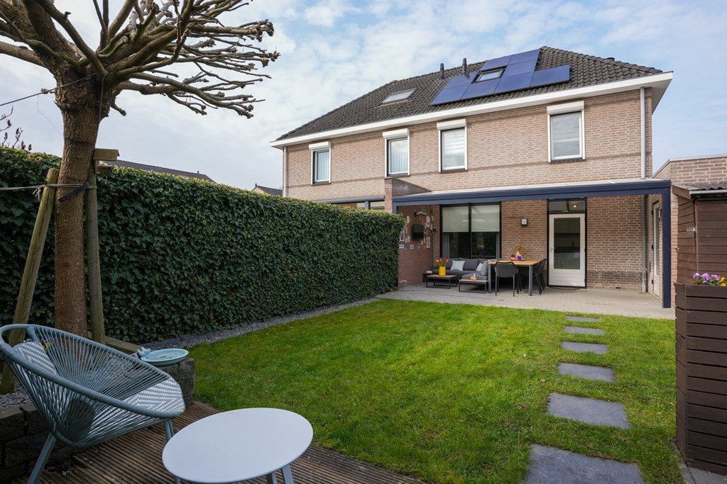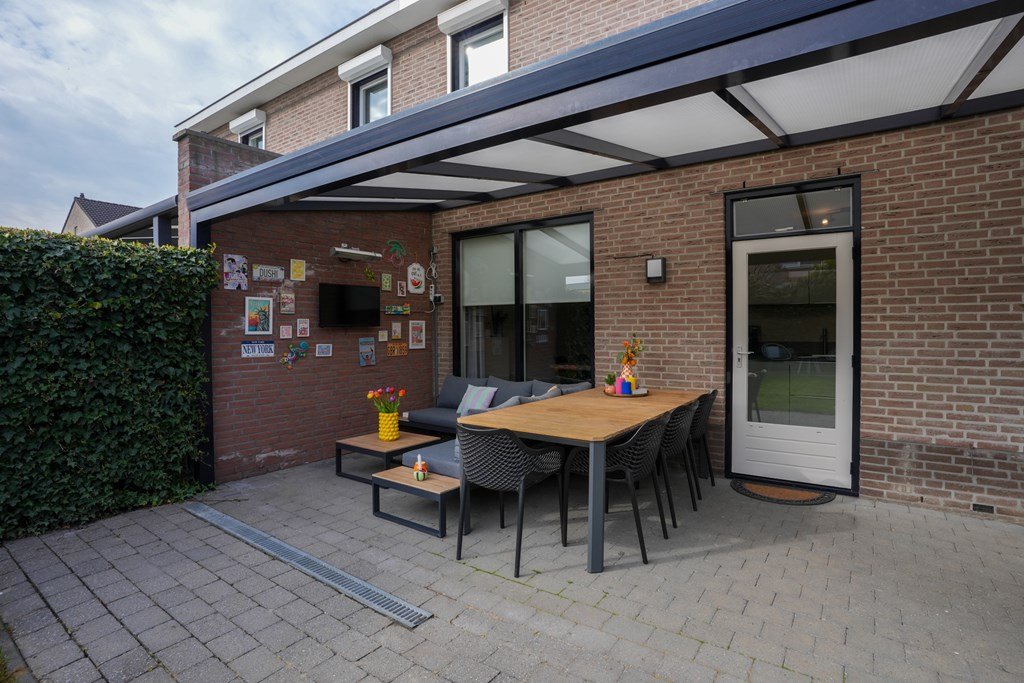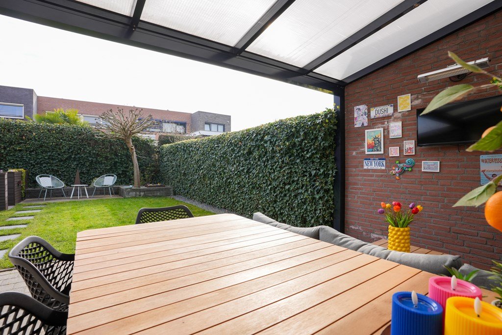 De ruime achtertuin is een plek waar je spontaan zin krijgt in lange zomeravonden, barbecuefeestjes en ontspannen koffiemomentjes. Onder de royale overkapping zit je altijd goed – weer of geen weer!