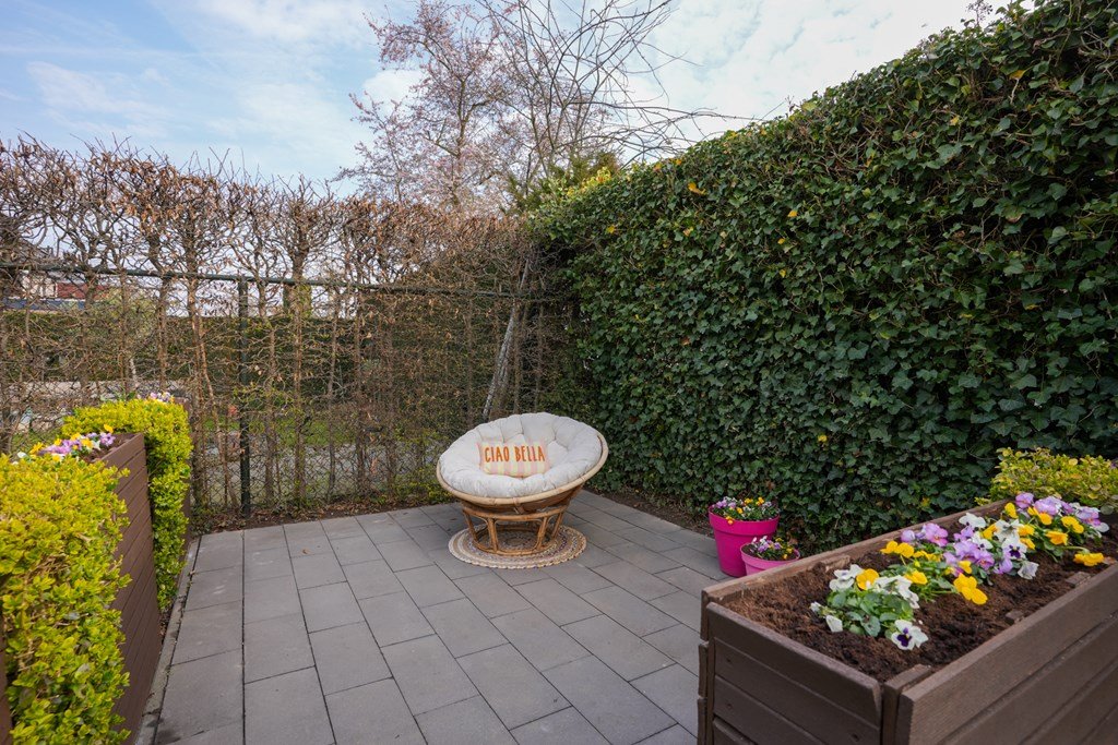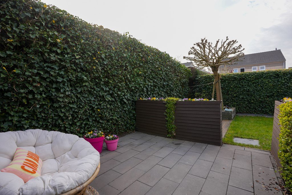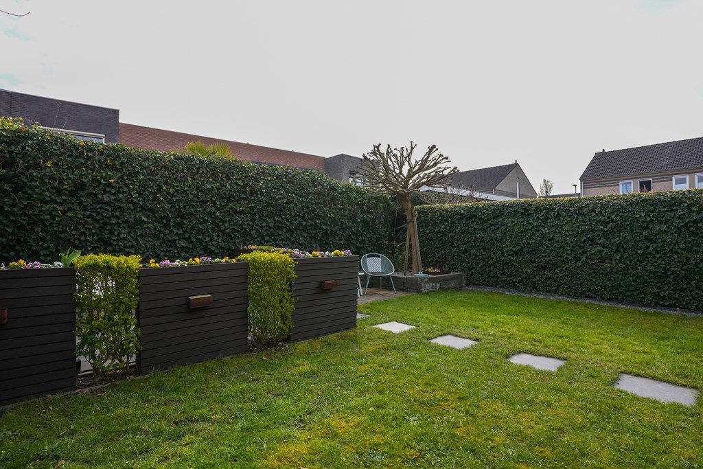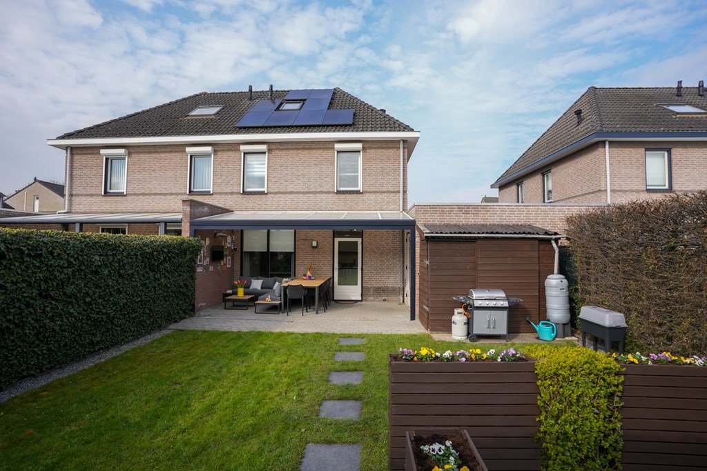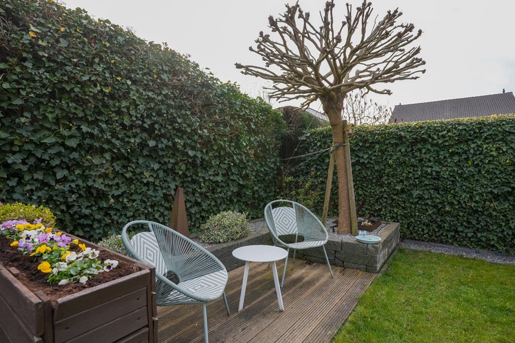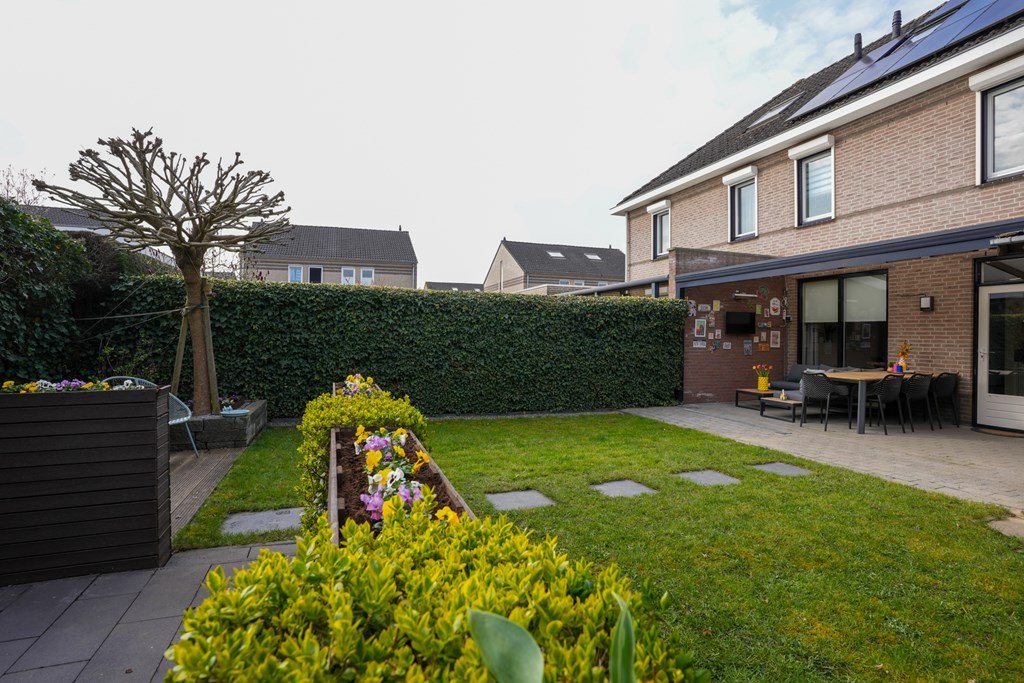 De ruime achtertuin is een plek waar je spontaan zin krijgt in lange zomeravonden, barbecuefeestjes en ontspannen koffiemomentjes. Onder de royale overkapping zit je altijd goed – weer of geen weer!