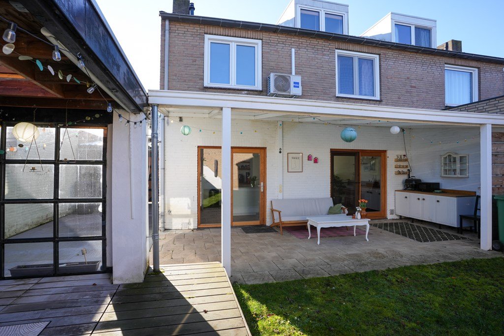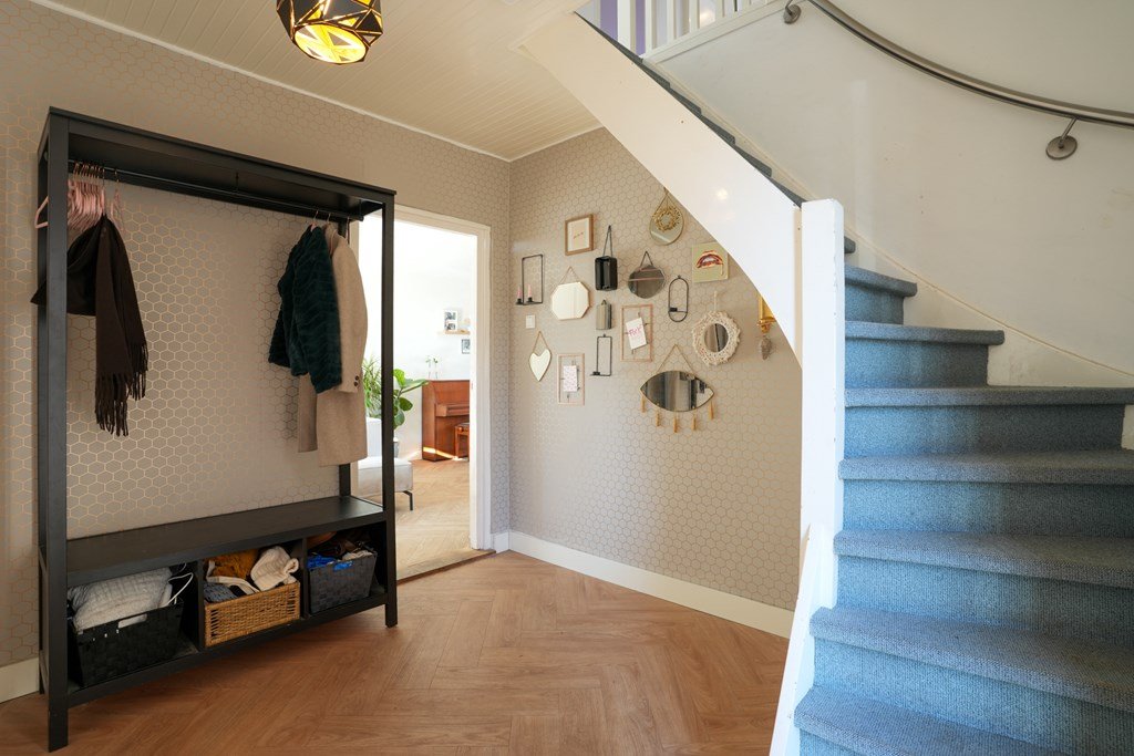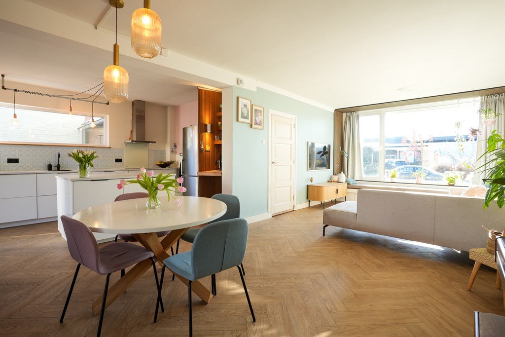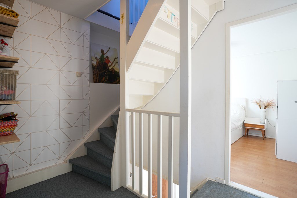 Binnen in de woning word je verwelkomd door een ruime hal, die direct toegang biedt tot de lichte woonkamer en de smaakvolle, ruime keuken. De ideale ruimte om gezellig te koken en te ontspannen met het gezin of vrienden. De separate toiletruimte maakt het geheel af. De houten trap leidt je naar de eerste verdieping, waar drie slaapkamers en een ruime badkamer op je te wachten staan. En de vierde slaapkamer? Die is met zorg gecreëerd op de tweede verdieping.
